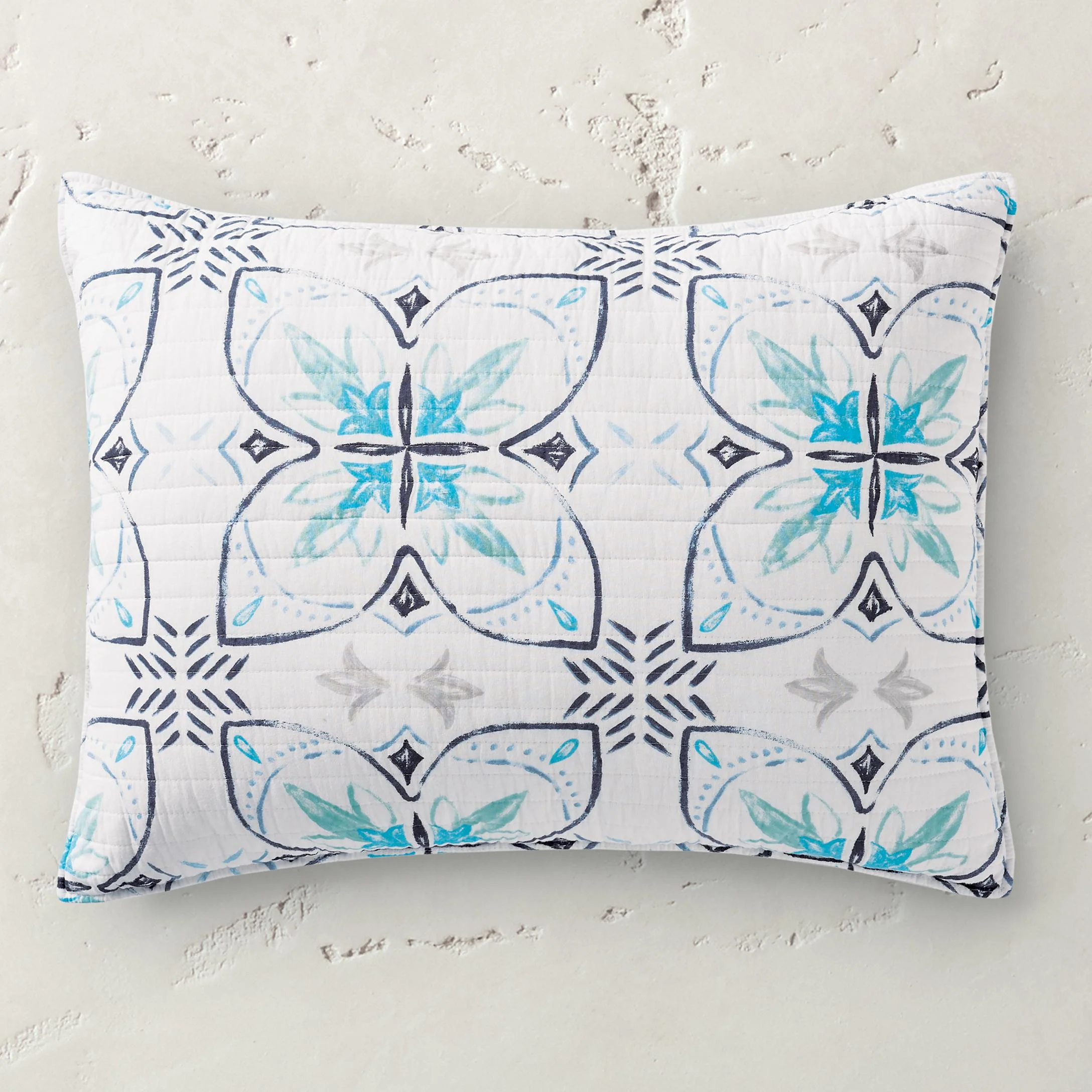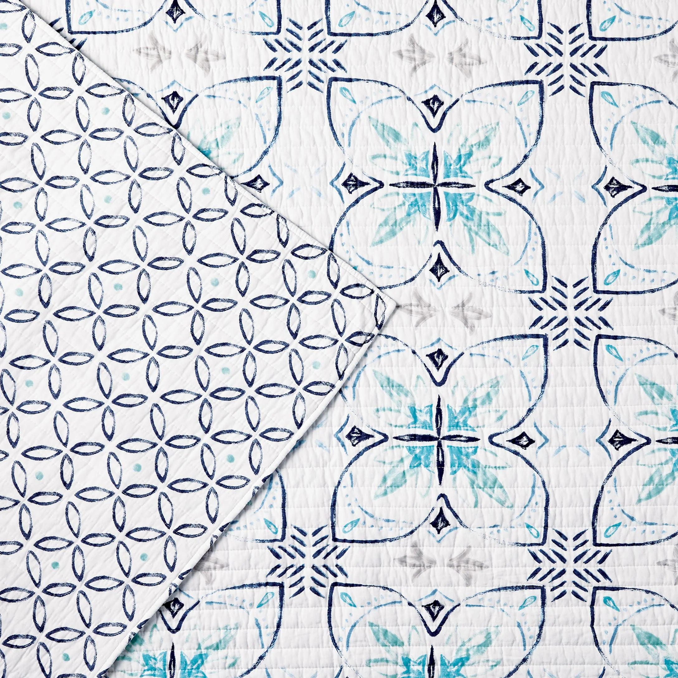 For this hand-painted pattern, I was inspired by the beauty of Portuguese tile and it’s Mediterranean colors. This look brings freshness into her bedroom with a classic combination of white and shades of blue.